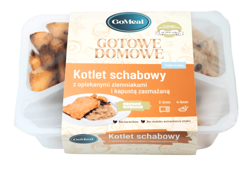 Składniki: opiekane ziemniaki 44,5% (ziemniaki 99,4%, przyprawa do ziemniaków), kapusta zasmażana 33,3% (kapusta kiszona 79,7%, mąka pszenna 13,3%, margaryna 6,6% (mleko), liść laurowy, ziele angielskie, pieprz czarny, sól), kotlet schabowy smażony 22,2% (mięso wieprzowe – schab 68,7%, bułka tarta (pszenica) 10,3%, panier 10,3% (mąka pszenna, sól, skrobia ziemniaczana), olej rzepakowy 6,9%, mąka pszenna 3,4%, pieprz czarny, sól), substancja konserwująca: sorbinian potasu (E202).