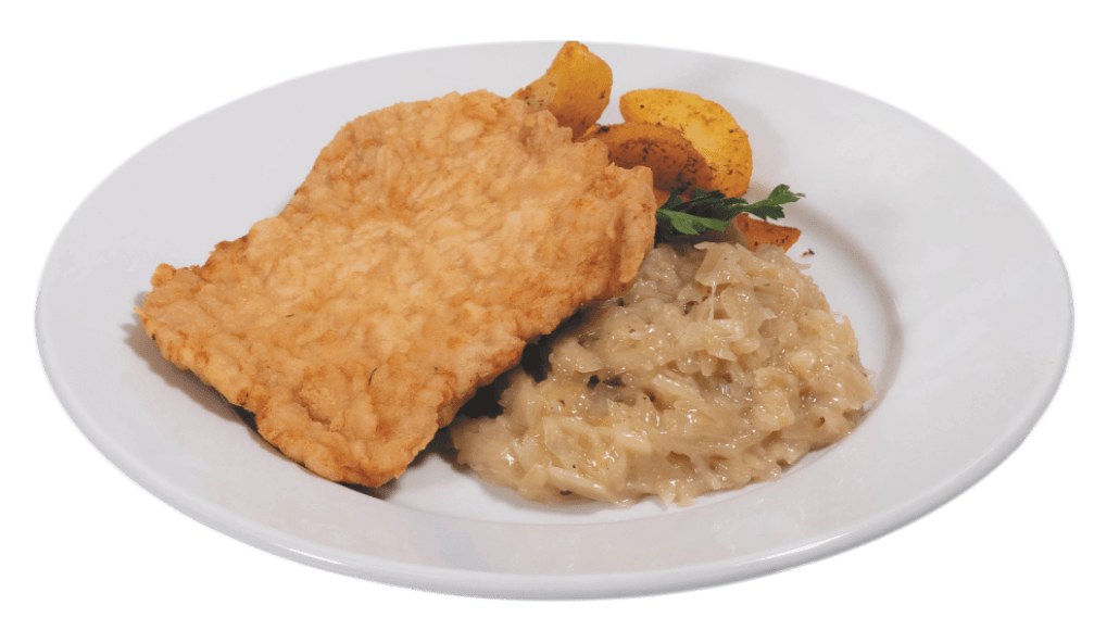 Tradycyjny kotlet schabowy w chrupiącej panierce, serwowany z zapiekanymi ziemniaczkami oraz kapustą zasmażaną według domowego przepisu. Smaki, które kojarzą się z niedzielnym obiadem u babci – teraz zawsze pod ręką.