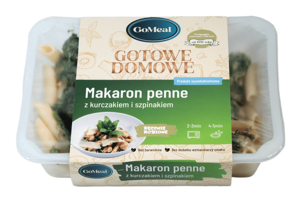 Składniki: makaron penne (pszenica) 44,4%, filet z kurczaka 33,3%, pieczarki 8,9%, szpinak 4,4%, śmietanka 30% (mleko) 4,4%, cebula 3,3%, olej rzepakowy, pieprz, sól, substancja konserwująca: sorbinian potasu (E202).